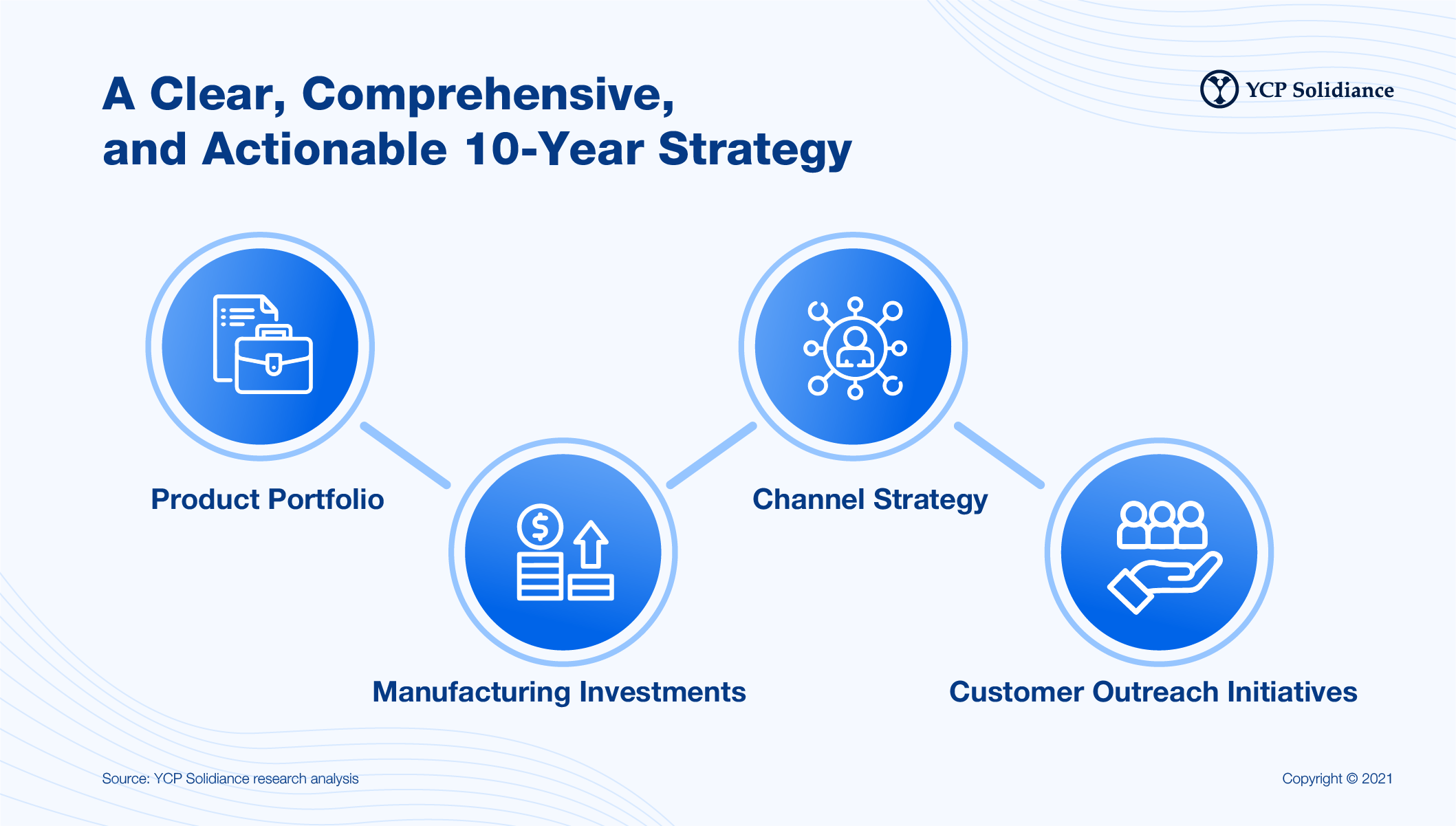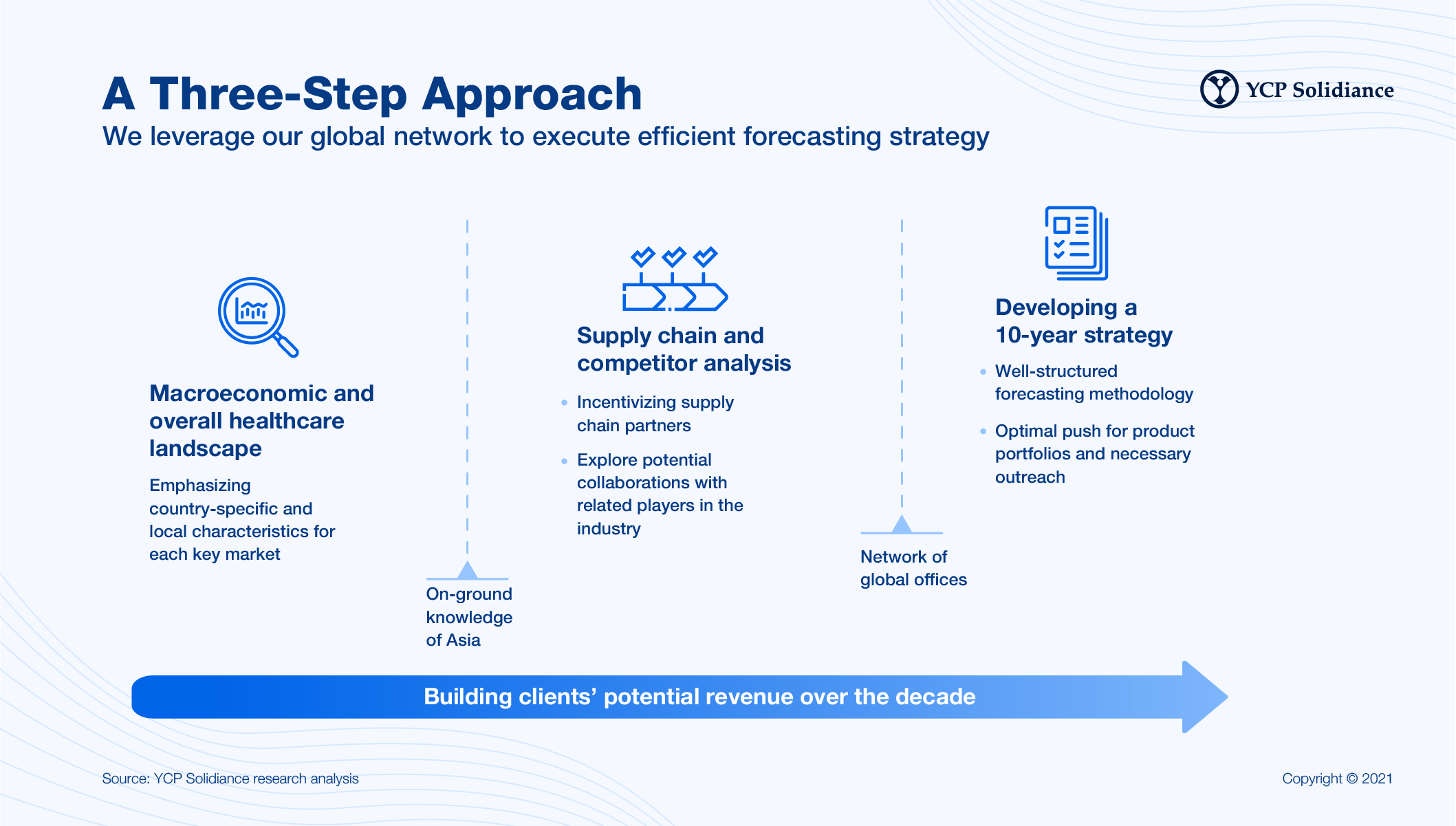 This process allowed YCP Solidiance to reasonably forecast the client’s potential revenues over the next decade based on three different business and financial scenarios, providing key expansion points and recommendations for a variety of outcomes.