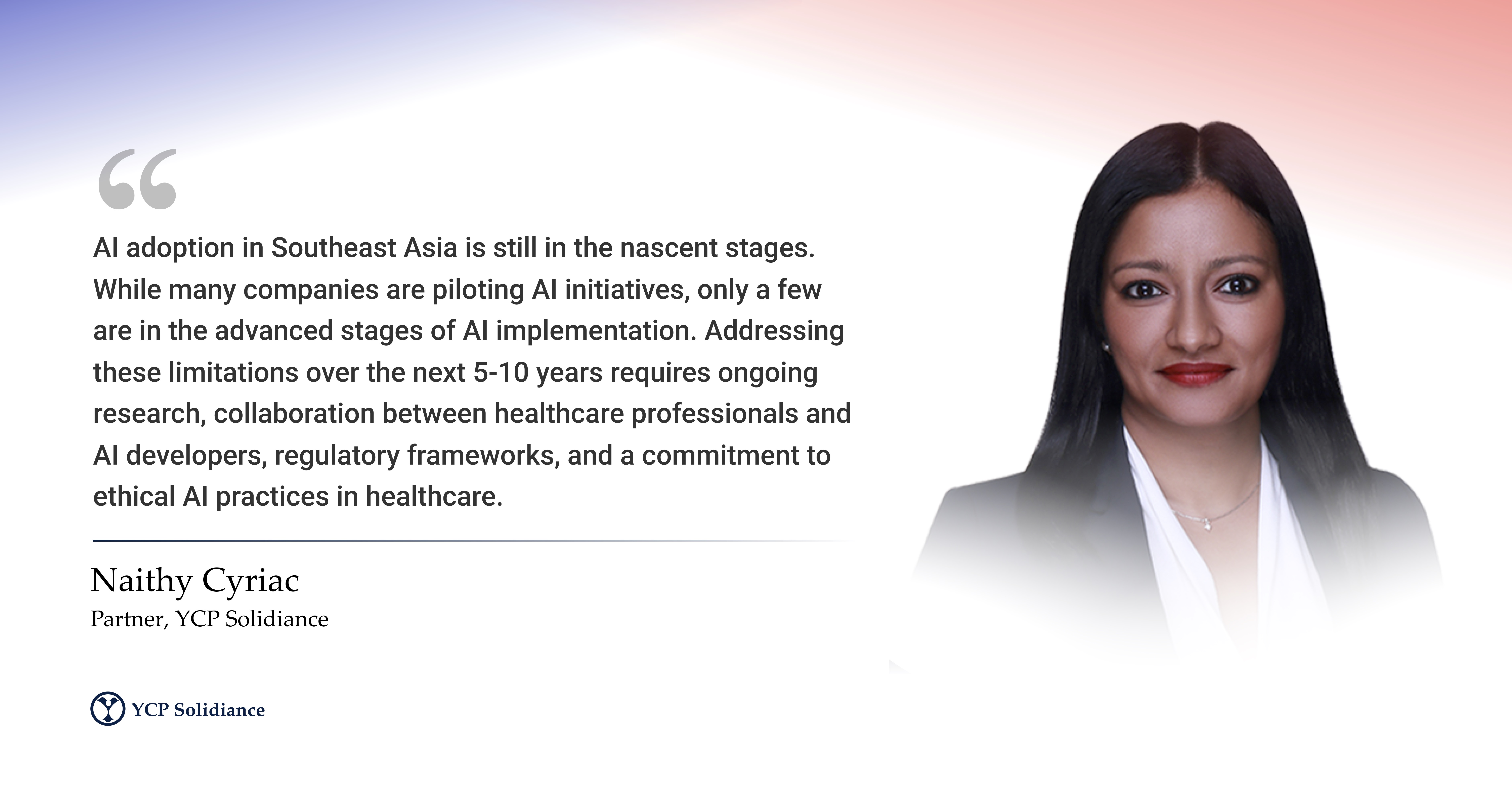 Southeast Asia is still facing limited private sector investment and slow response from governments to keep up with rapidly evolving AI technology and the expanding pool of potential AI users. The region is also subject to relatively inequitable and sparse provision of ICT infrastructure. Apart from Singapore, most countries in the region struggle to keep pace with the needed internet speed and widespread infrastructure for advancing digital health. As a result, AI adoption is still in the nascent stages. While many companies are piloting AI initiatives, only a few are in the advanced stages of AI implementation. Addressing these limitations over the next 5-10 years requires ongoing research, collaboration between healthcare professionals and AI developers, regulatory frameworks, and a commitment to ethical AI practices in healthcare.