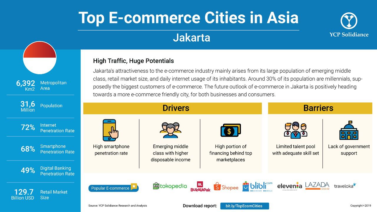 Jakarta, a home to more than 30 million people, is considered as one of the busiest cities Furthermore, beyond its physical development, the city's e-commerce landscape is surely not to be overlooked. According to our report, Jakarta is among the top e-commerce cities in the region, along with other cities, including Bangkok, Shanghai, Seoul, and many more. Based on our study, its large emerging middle class population, retail market size, and daily internet usage, with 30% of its population are millennials, the biggest customers of e-commerce, are what factors that bring the city's attractiveness in the industry.