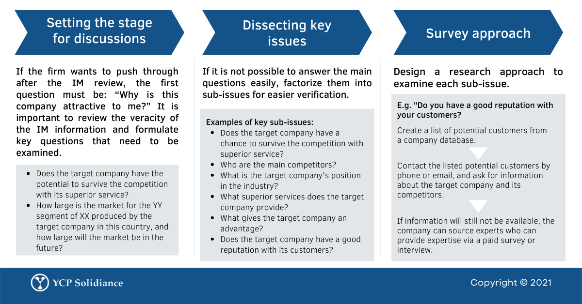 When conducting business due diligence, the following issues need to be specifically covered, as this will determine whether or not the process has been conducted properly: