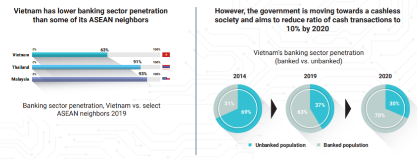In order to minimize the gap with other countries in the region in terms of financial inclusion, Vietnam’s government has approved a financial scheme for the development of non-cash payments in Vietnam effective from 2016-2020. The plan aims to reduce the ratio of cash transactions to 10%, reaching 70% banked accounts by 2020, and the progress was already visible in 2019.