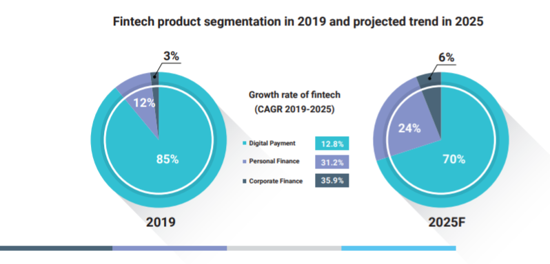 Although digital payment is currently leading in terms of players and investment, personal and corporate finance is expected to grow at a faster rate through 2025.