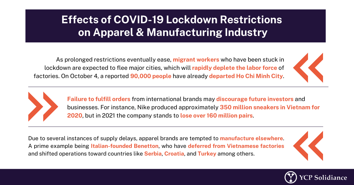 Due to strict and prolonged COVID-19 lockdown measures imposed in Vietnam, the country’s apparel manufacturing industry is under threat of losing its status as a manufacturing powerhouse for international apparel brands. Restrictions in place have limited the operational efficiency of factories, and global brands like Nike and Gap are set to experience product shortages—a concerning development, especially when considering the potential economic implications involving such a disruption.