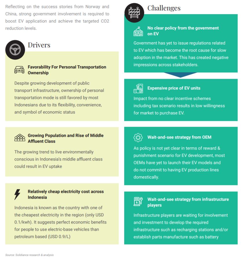 All in all, Indonesia presents a great opportunity for EV players to enter, grow, and expand their businesses. Through all its drivers and many of its fossil-fuel related problems, Indonesia has become an ideal market for the EV industry. Strong government involvement is required to drive the EV implementation to success, as the government's clarity around EV policies will be key in tackling challenges of EV development in Indonesia.