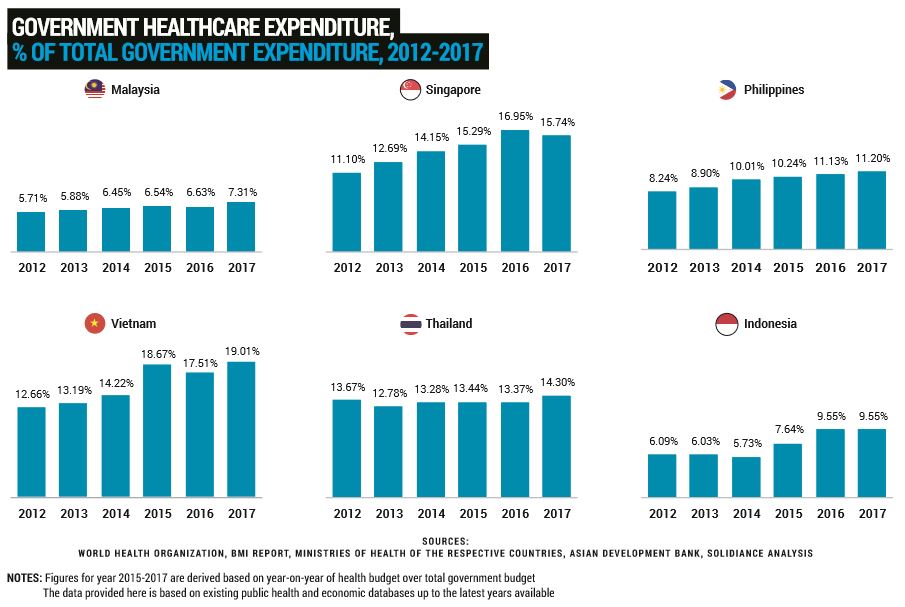 Compared to the global average, the overall healthcare spending allocation of ASEAN 6 countries are at a relatively low level. Nevertheless, the governments of ASEAN 6 countries are unlikely to set aside a higher proportion of national budgets to healthcare spending. This is due to the fact that these countries are more likely to allocate their budget towards a crucial sectors such as massive infrastructure plans and economic stimulus, as the result of trade wars and tensions in the South China Sea.