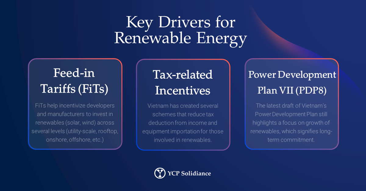 Aside from reducing income and equipment import tax, perhaps the foremost reason as to what has stimulated renewable energy growth in Vietnam is the implementation of generous feed-in tariffs or FiTs; a term which refers to policies that are designed to drive investment and use of renewable energy. Similarly, the early drafts of the Power Development Plan VIII (PDP8) indicate that there is a firm commitment from the government to bolster Vietnam’s adoption of renewable energy and a gradual shift away from fossil fuels.