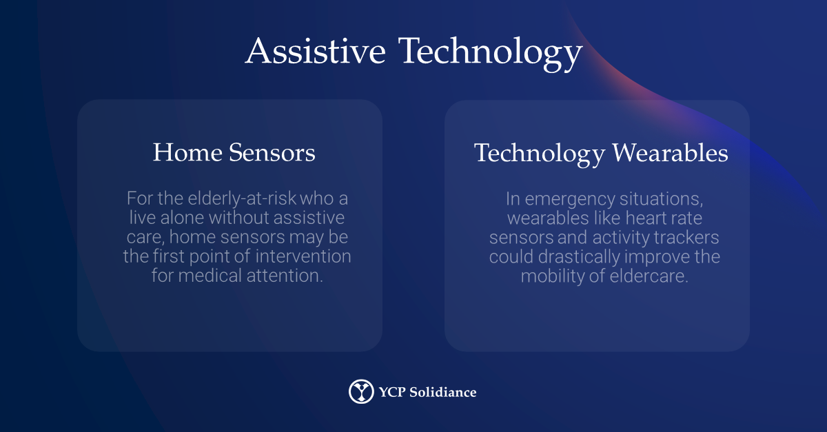 - Assistive Technology: In addition to leveraging technology for telemedicine, it may also be applied to assistive technologies that improve the day-to-day lives of the elderly. The development of assistive technology also helps communities refine their first-hand intervention and medical response through digital solutions such as home sensors and wearables (i.e., smartwatches, activity trackers).