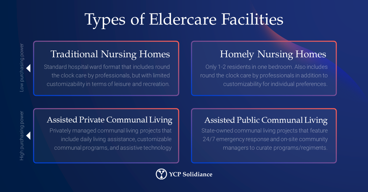 - Diversifying Eldercare Facilities: A large part of the eldercare landscape in Singapore are the living facilities available to the aged. Depending on several factors that vary from case to case, such as income or a patient’s medical needs, the type of living facility needed also changes. Thus, elder care providers must further diversify the current living models available, such as traditional nursing homes or assisted communal living (both private and public).