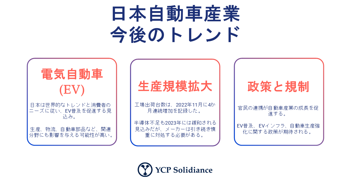 今後、日本が世界的トレンドに従い電気自動車の販売を強化することで、国内自動車産業に対して下記3点のメリットが期待されます。