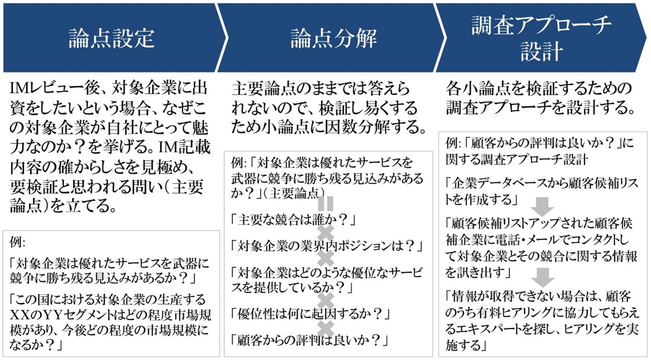 着手する際は、「何を検証するのか?」という問いを設定することから始めます。まず主要な論点を設定し、その論点を検証しやすい問いに分解した上で、それらを検証するための調査アプローチを設計します。