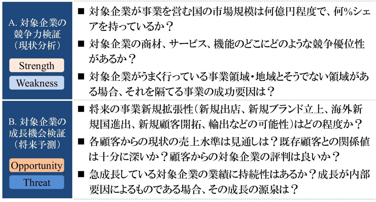 ビジネスデューデリジェンスの実施に際して、具体的には、下記の論点を網羅する必要があります。実施後に以下の問いにスムーズに答えられる状態になっているかどうかが、そのビジネスデューデリジェンスが適切に実施されたかどうかの目安となります。