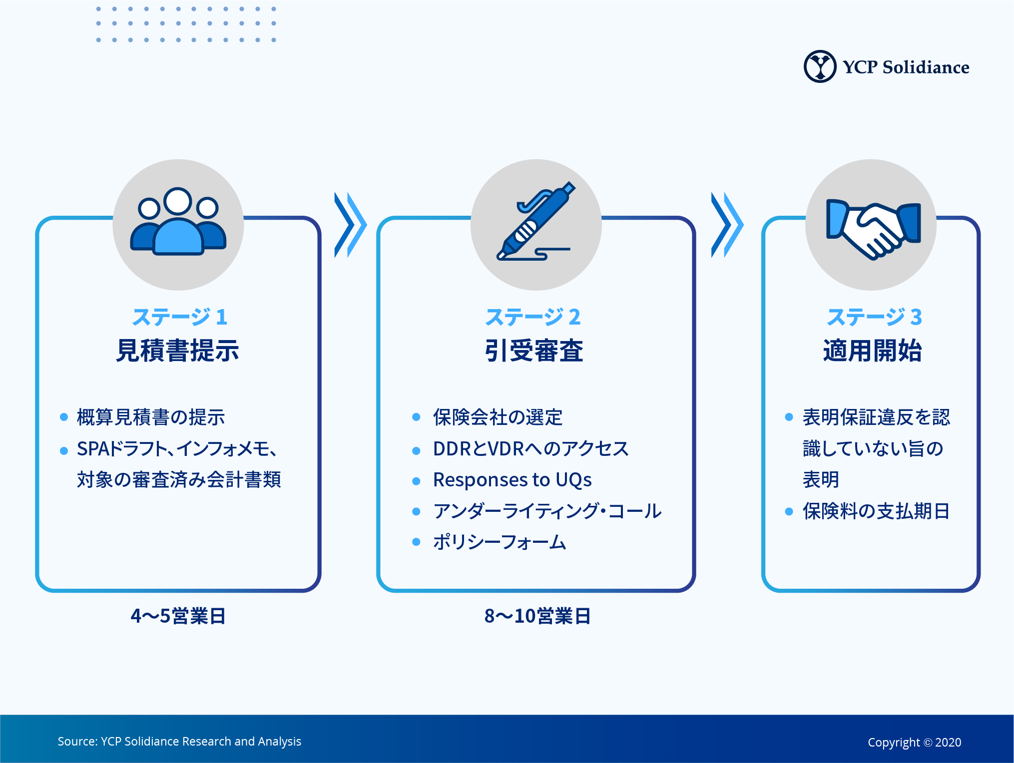 表明保証の取得には3つの段階があります。まず要求されたオプションに対する保険料の提案から始まり、法的拘束力のない見積書と草案の提出が行われます。その後、デューディリジェンス報告書、ディスクロージャーレター、その他の裏付け情報を必要とする引受審査が行われます。最終段階では、保険会社が表明保証違反を認識していない旨を確認するための通知書(No Claims Declaration)への署名が行われます。