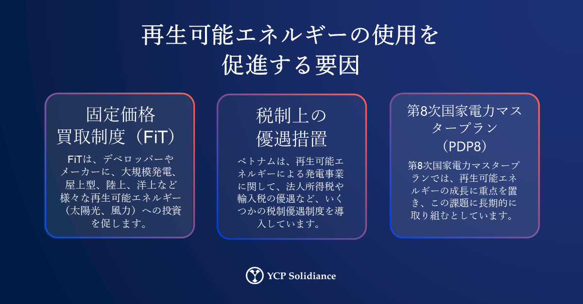 ベトナムで再生可能エネルギーの普及が進んだ最大の理由は、法人所得税や輸入税の優遇制度もさることながら、再生可能エネルギーへの投資や利用を促進するための政策「固定価格買取制度(FiT)」の導入であると考えらえます。「第8次国家電力マスタープラン(PDP8)」の草案でも、再生可能エネルギーの導入と化石燃料からの移行に対するベトナム政府の強いコミットメントが示されています。