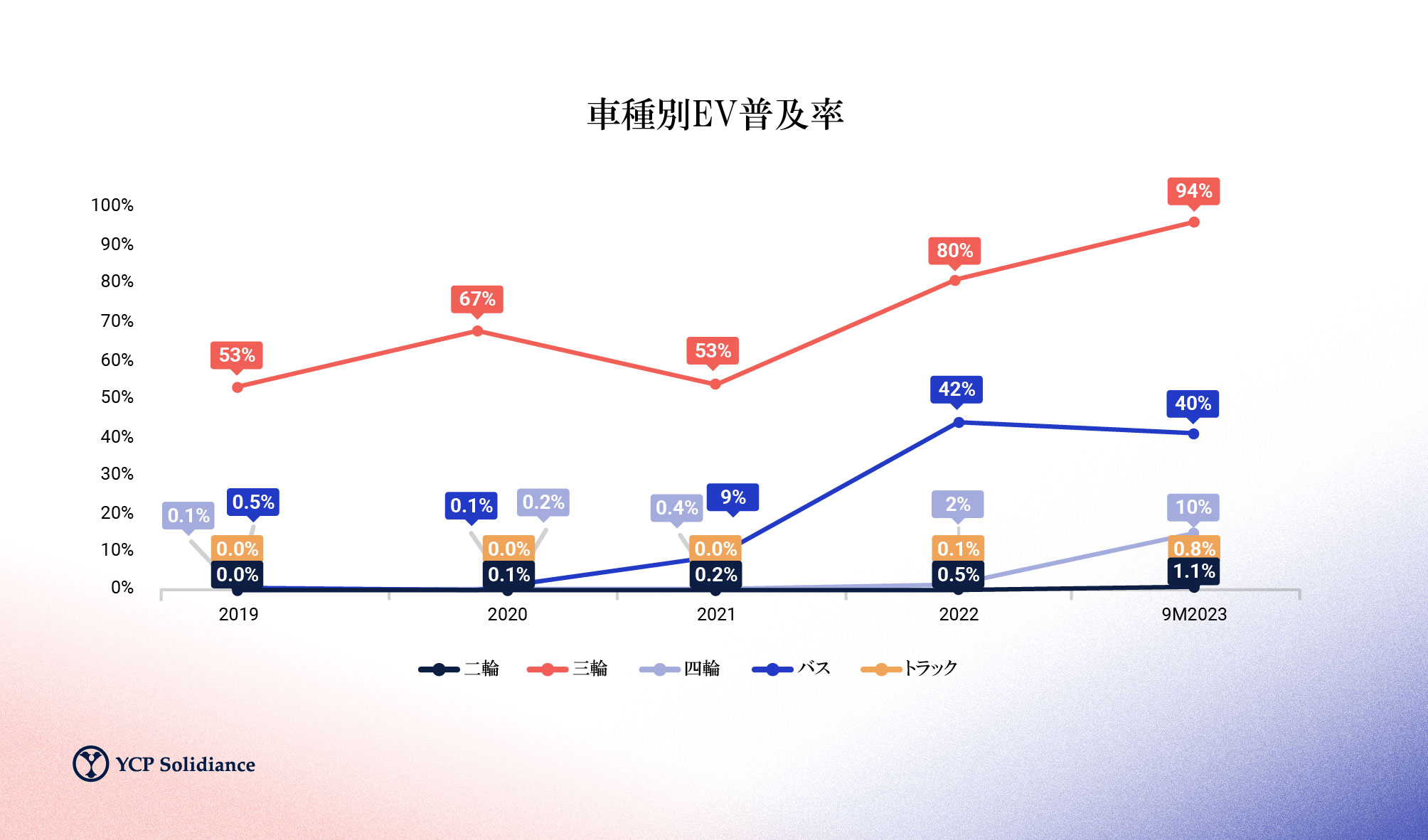 2020年以降、タイのEV市場は著しい成長を遂げており、2023年9月時点で乗用EVの普及率は10%に達しています。また、二輪車も好調なトレンドを示し、三輪車も成長傾向にあります。三輪車については、電動三輪タクシーが普及を促進しており、MuvMiなどの地元企業が今後5年間で保有車両を5,000台に拡大することを目指しています。